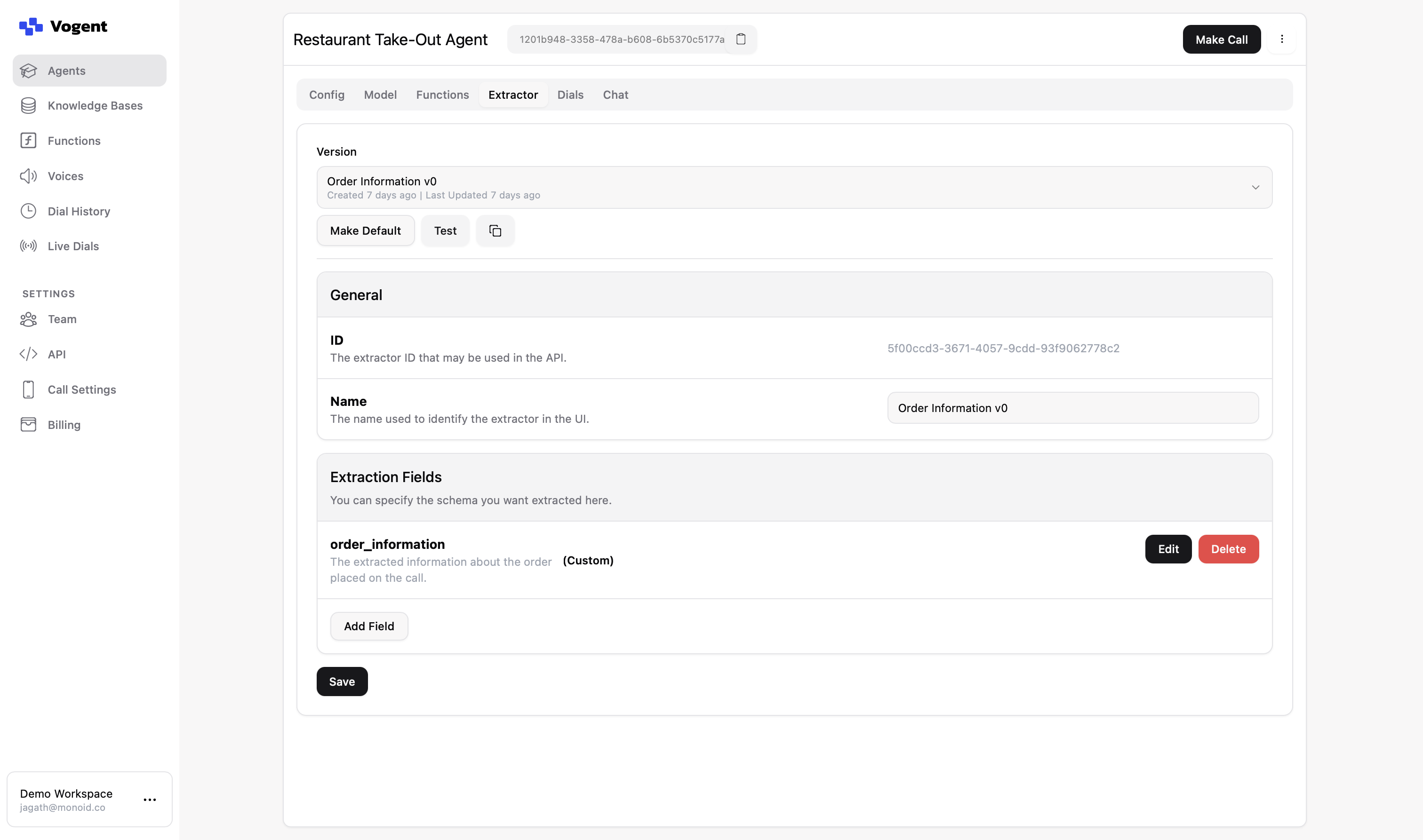 Extraction fields define the schema of data you want to capture from each call. To add a field:1