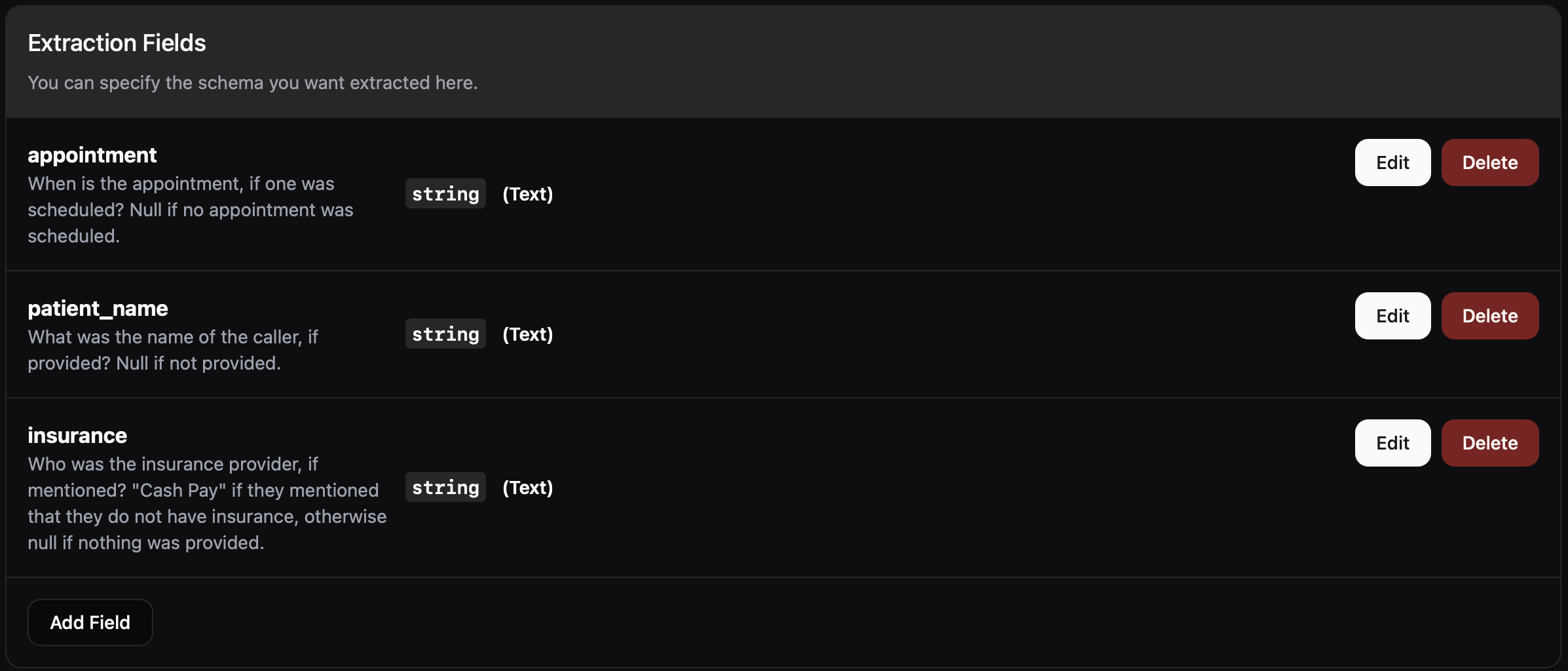 After the call is completed, you can retrieve the appointment details from the call using the Dial Extractor webhook. The webhook will return the extracted appointment details in the format defined within the agent’s Extractor tab. For this particular agent, we’ve defined a few relevant fields that could help a provider enter a patient’s appointment into their systems.