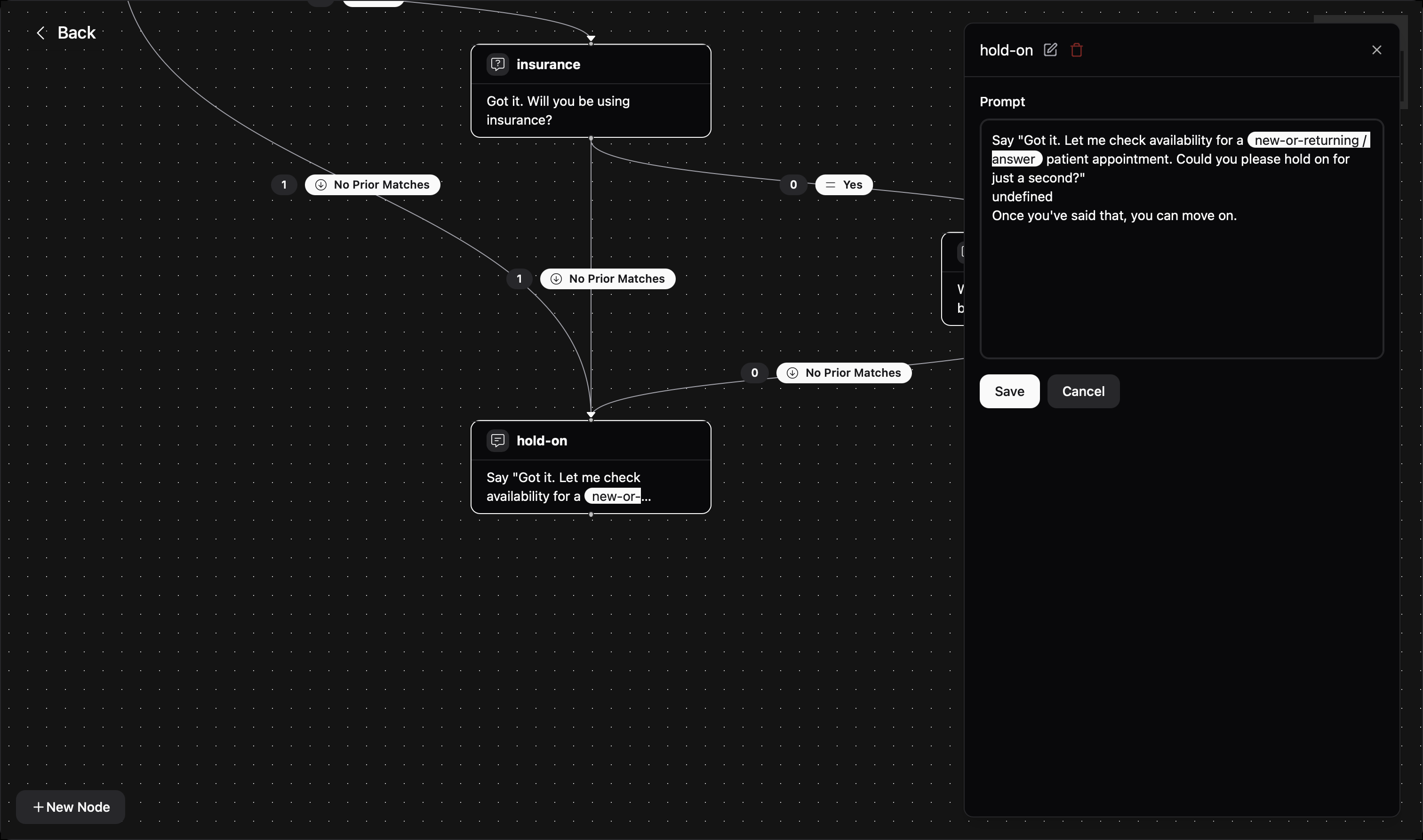 A freeform node is a node in which the agent is prompted to engage in some sort of exchange with the respondent. It can be useful for inserting a remark, or having the agent offer some pleasantries at the end of a call. Note that a freeform node will only progress if it’s prompted to do so given some condition; otherwise, it is a terminal node.