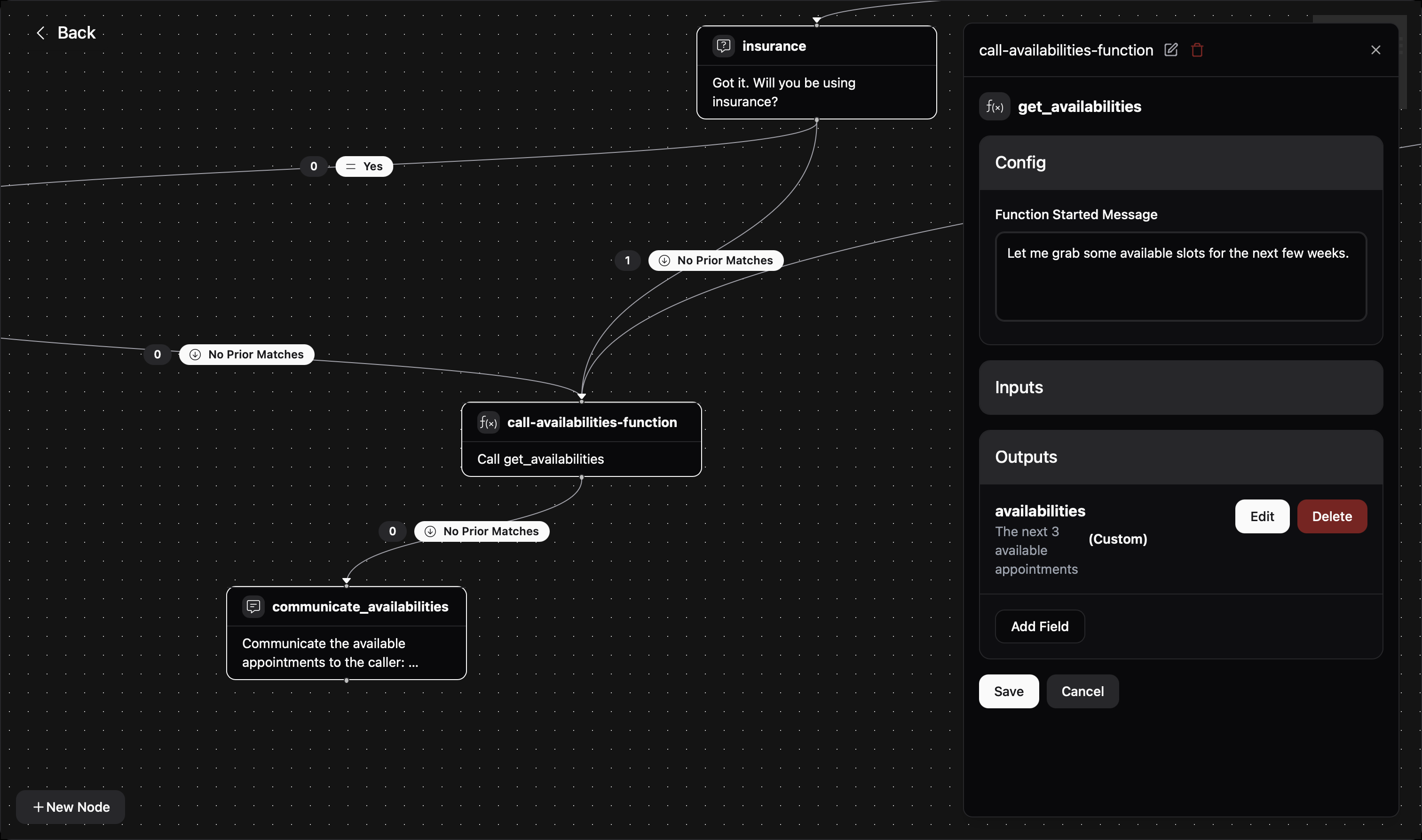 A function node is used to call an external function. For more information on how to add tools (like functions) to your agent, check out the tools guide. In this particular agent, we’ve defined a function calledget_availability that hits an external API to get appointment availability.
