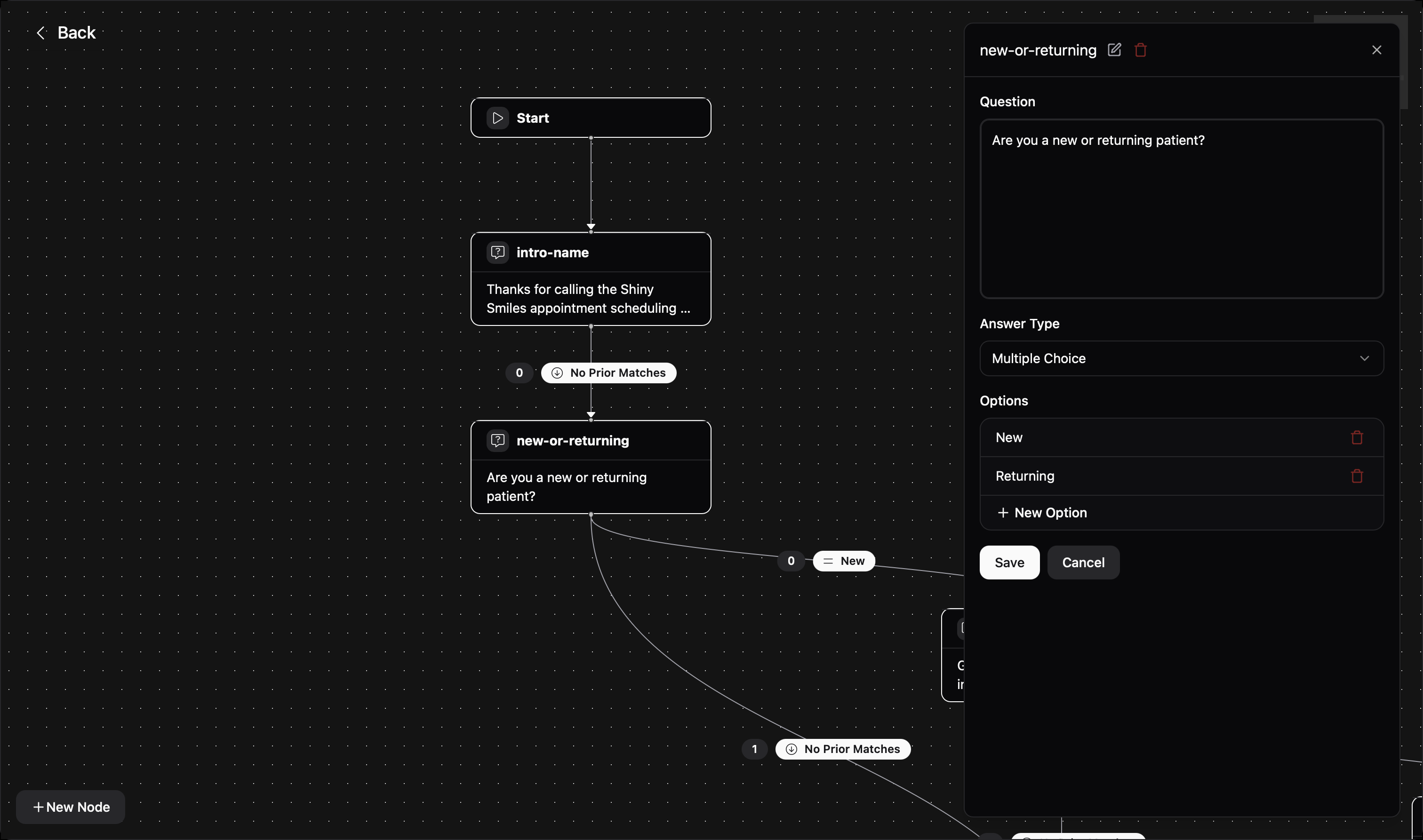 A question node is used to ask a question to the respondent. You can indicate the question text, the answer type (e.g. Freeform, Multiple Choice, Multiple Select, etc.), and the answer options. Note that the provided answer does not have to verbatim match the answer choices; the model will match the provided answer to the closest choice.