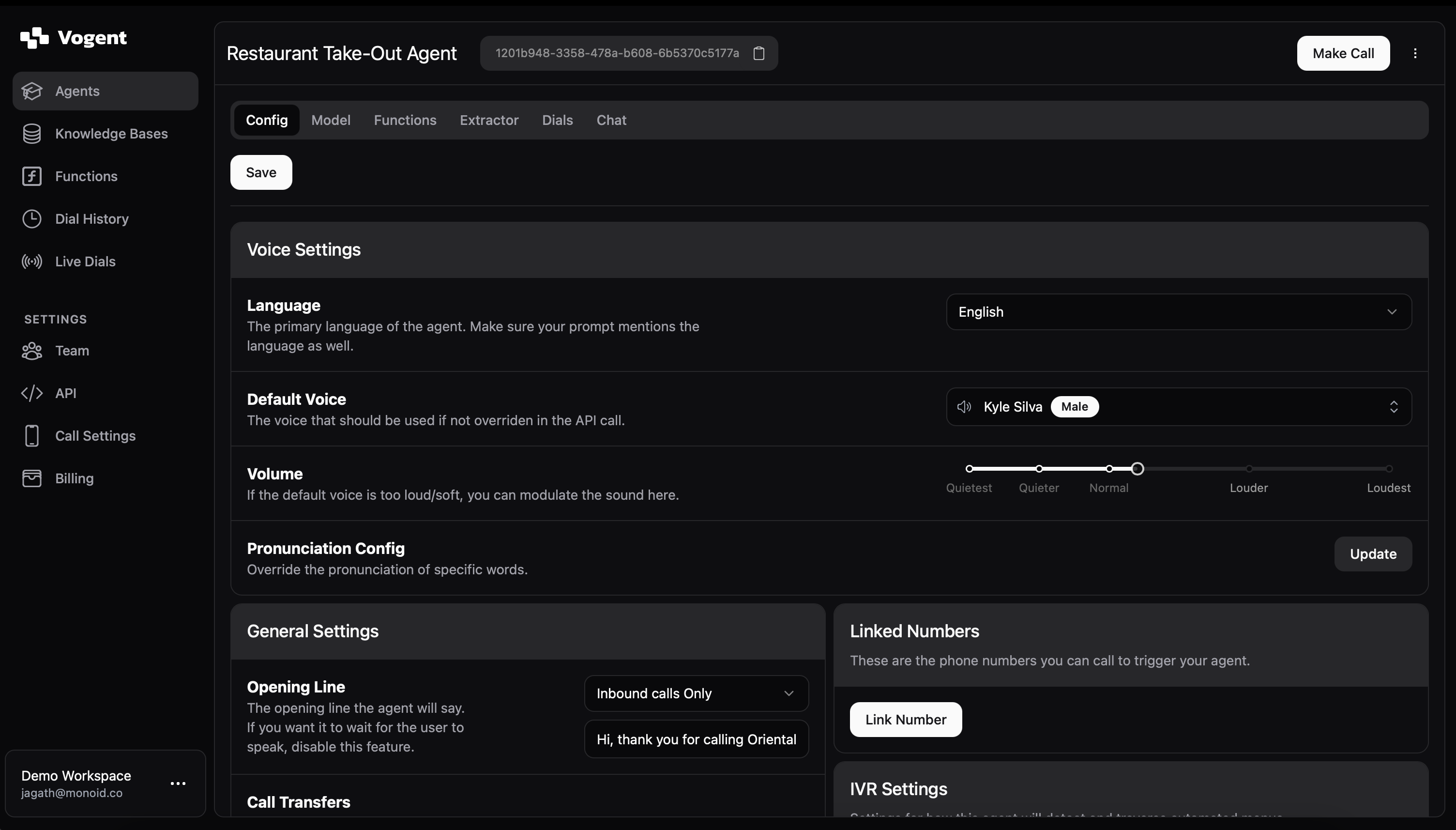 Once you click into your cloned agent, you’ll see the agent’s configuration page. This is mission control for your agent, where you can configure the agent’s behavior and settings, go through past dials and run evaluations, and more.