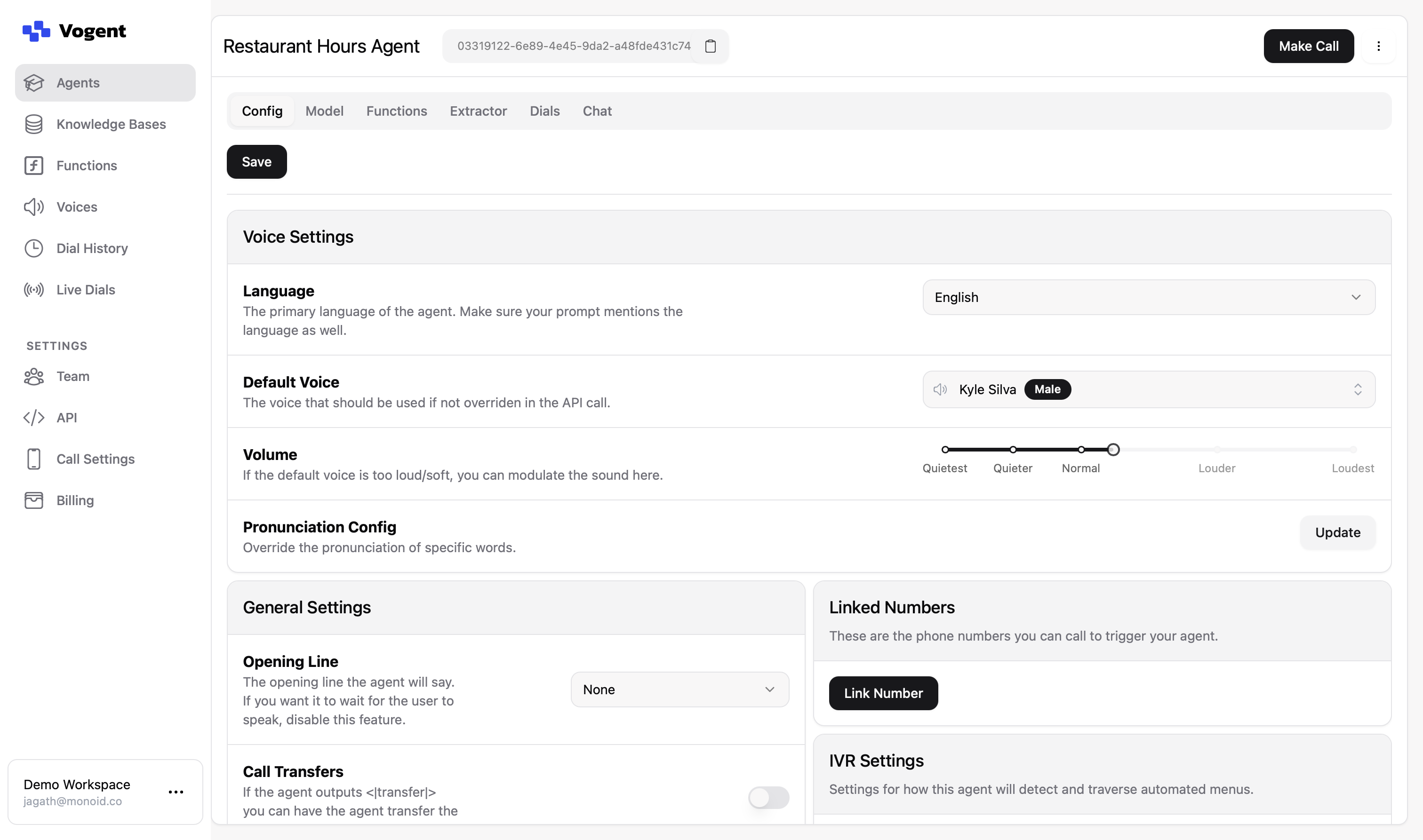 Once you click into your cloned agent, you’ll see the agent’s configuration page. This is mission control for your agent, where you can configure the agent’s behavior and settings, go through past dials and run evaluations, and more.