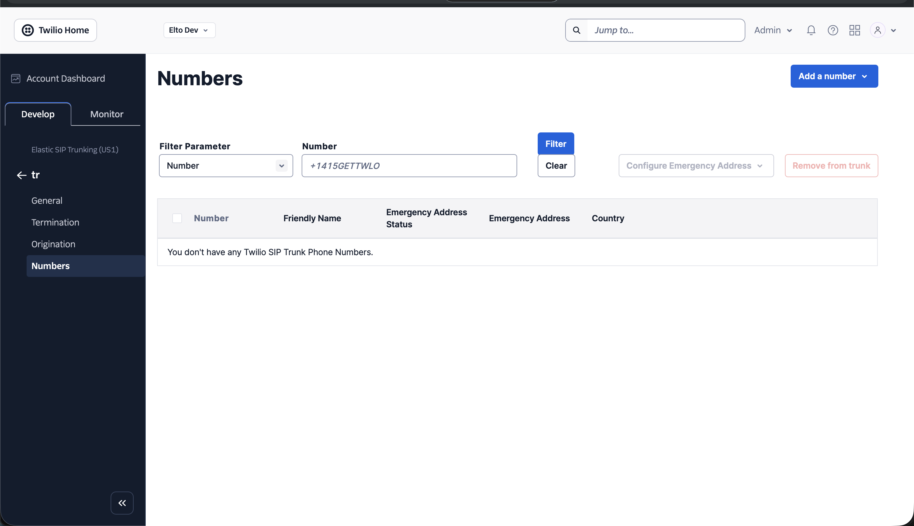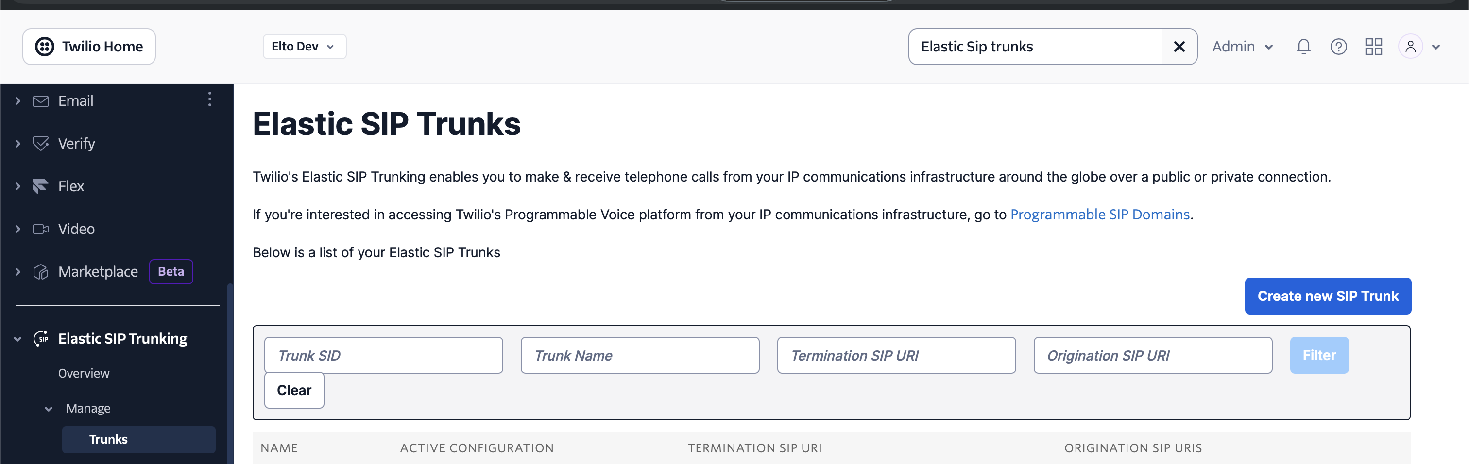 - Go to the Twilio Console and search for “Elastic SIP Trunks,” and navigate to the page.