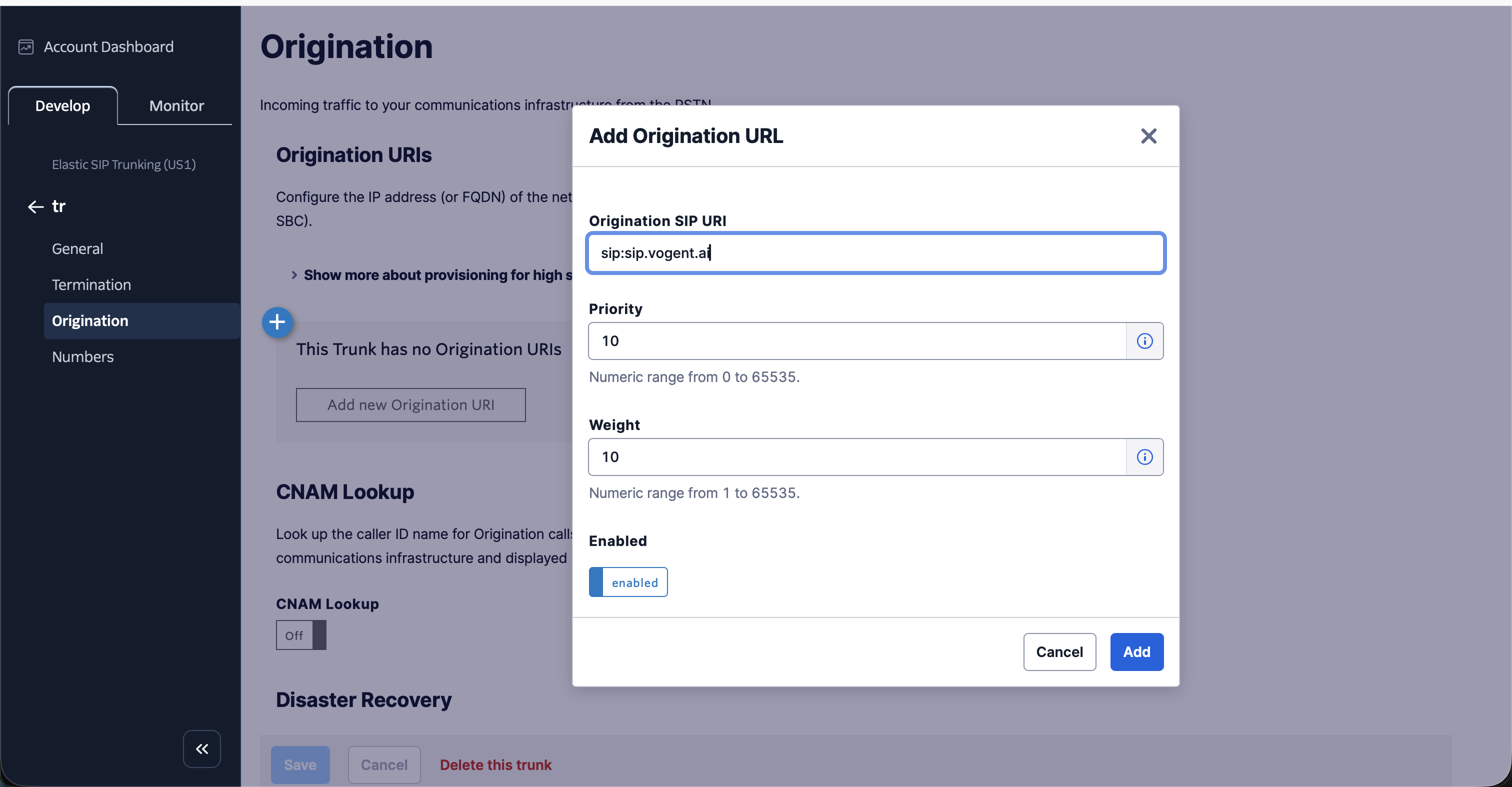 - Go to the Origination tab in your SIP trunk settings, click “Add New Origination URI”, enter