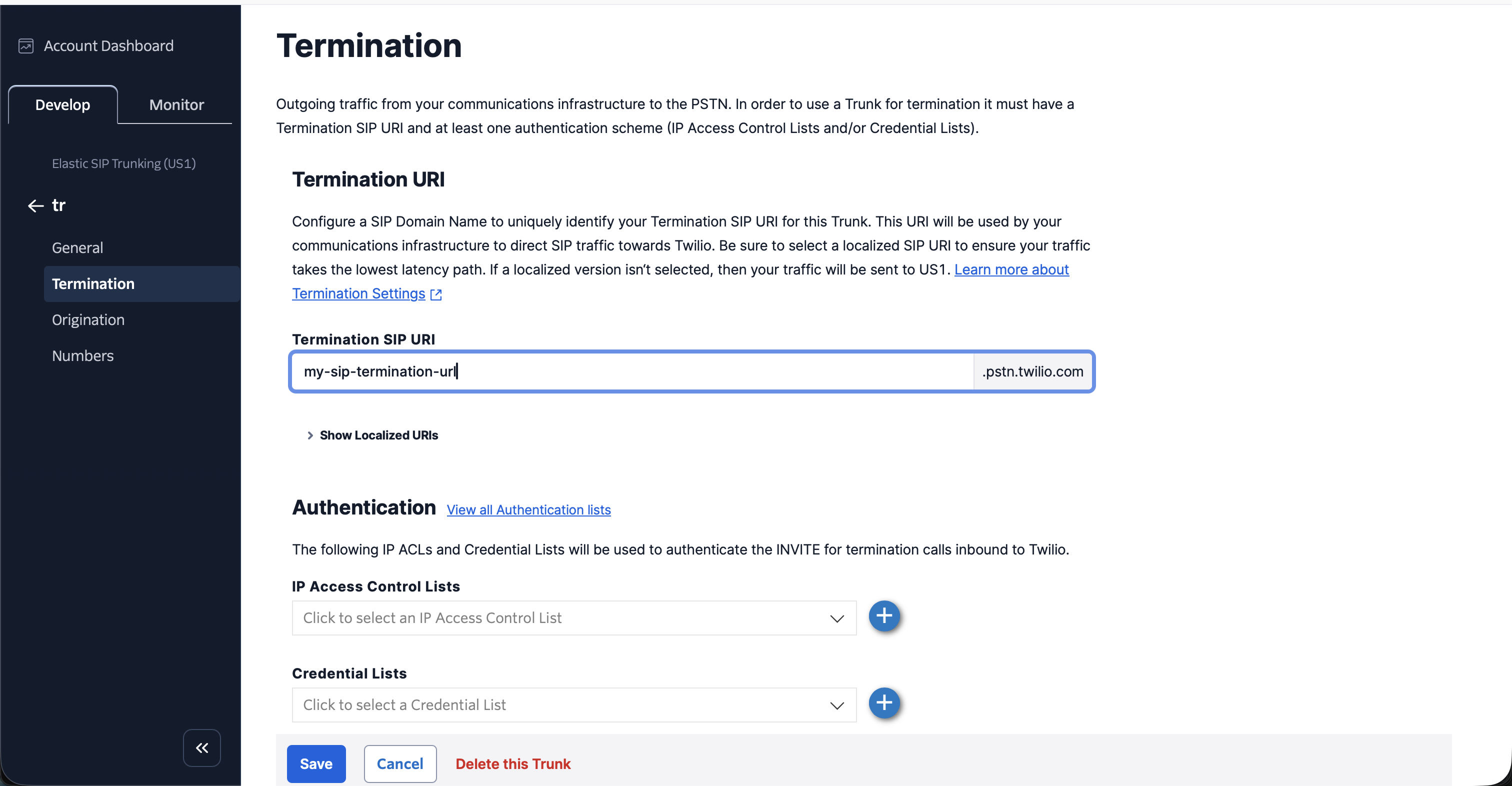 - Go to the Termination tab, and enter a Termination SIP URI, you can pick any URI you want.