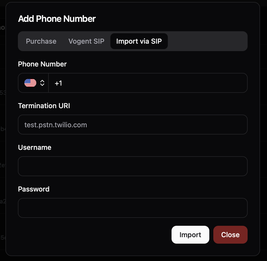 your-trunk-name.sip-us.vonage.com. - In Vogent, Go to the Call Settings tab in the left sidebar, and click Import via SIP, and enter the termination URI and credentials you created in steps 1-3. You may also do this using the Create Number API with