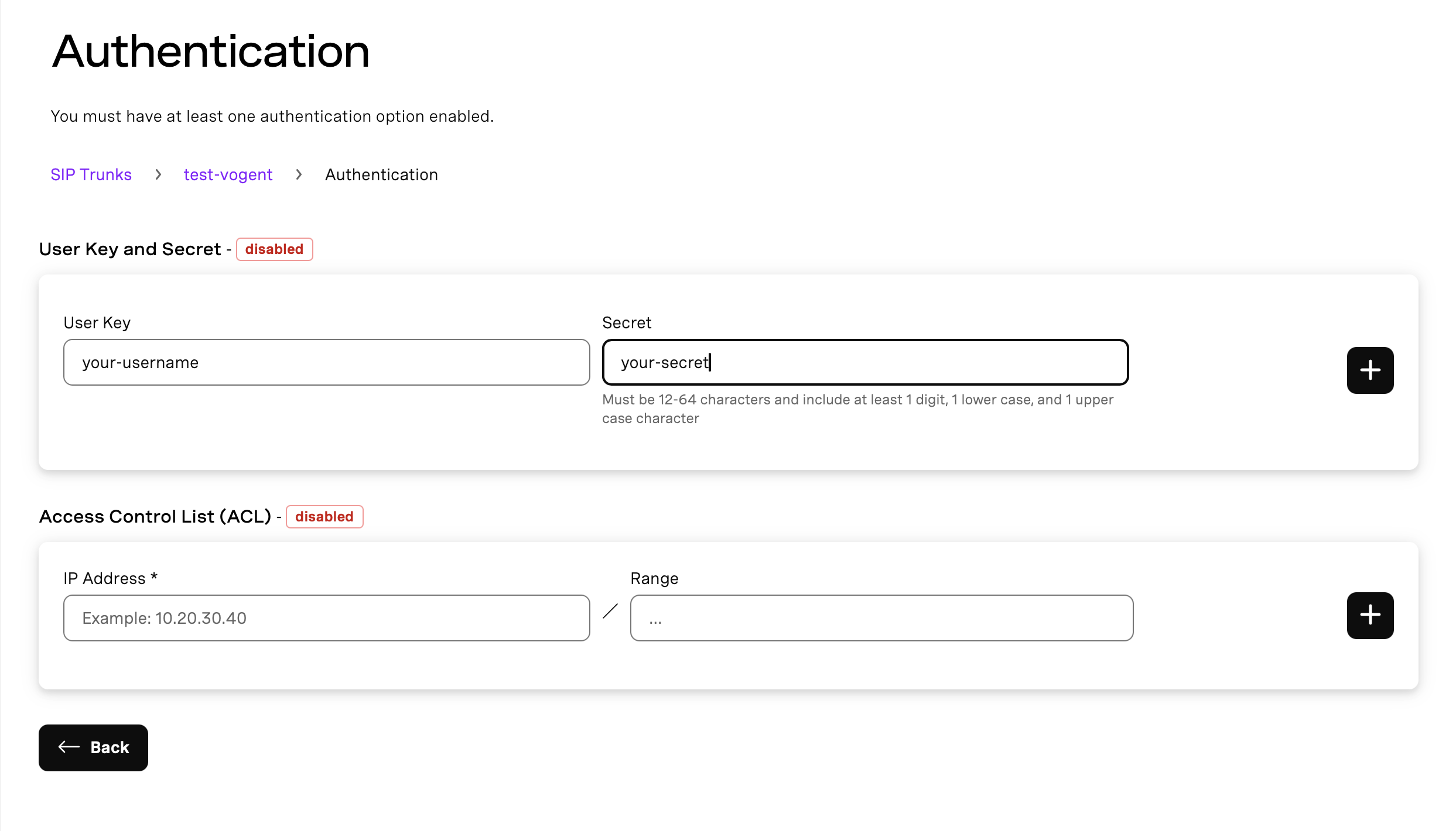 Make sure you leave the ACL field empty, as Vogent does not support a static range of IP addresses for outbound SIP calls outside of the enterprise plan. Please contact us if this is a security requirement for your use case.