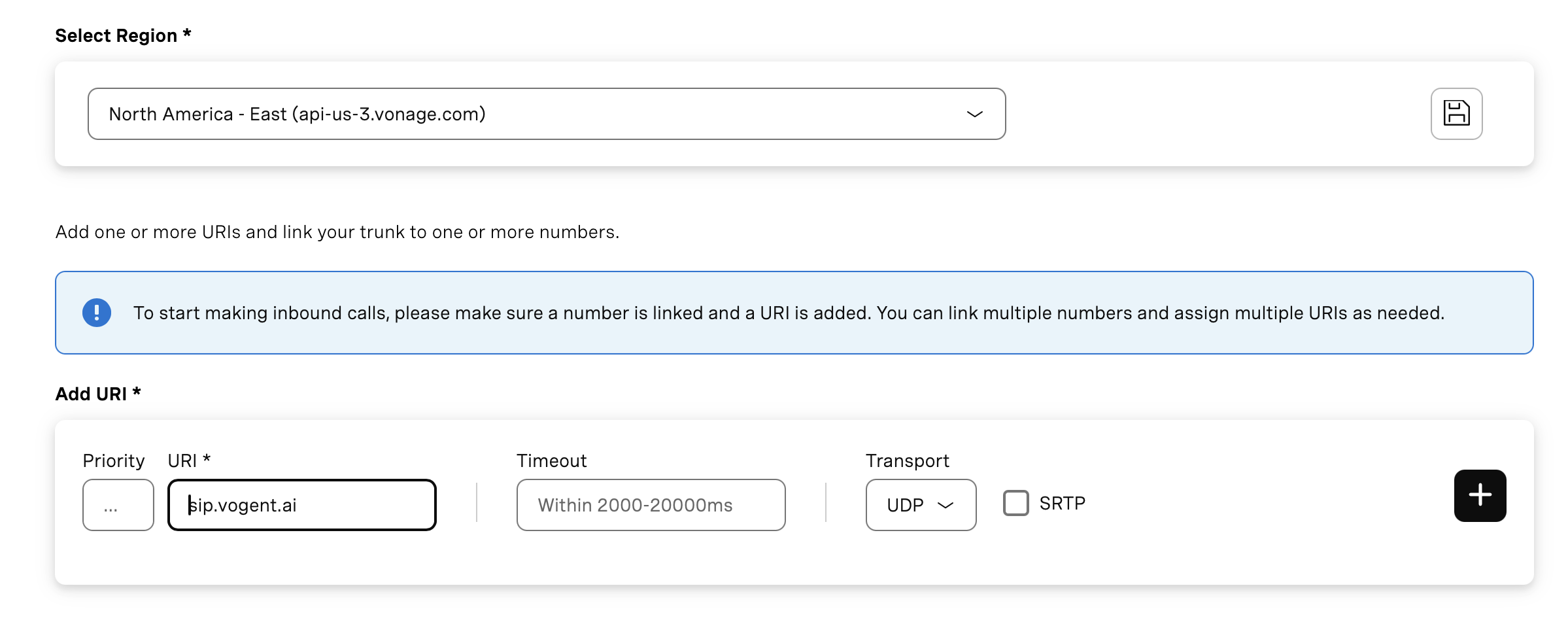 - Under the “Add URI” section, enter “sip.vogent.ai” under URI, and click the plus icon.