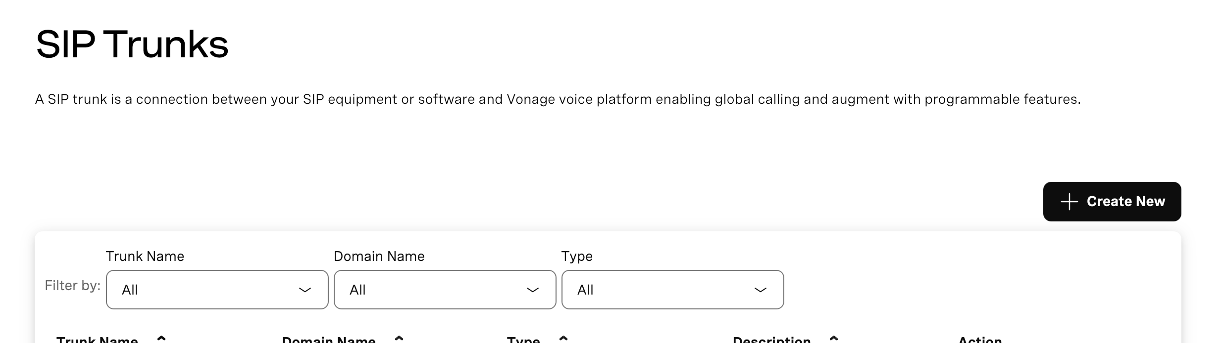 - Click Create New, you should automatically be taken to the page where you can configure your SIP trunk.